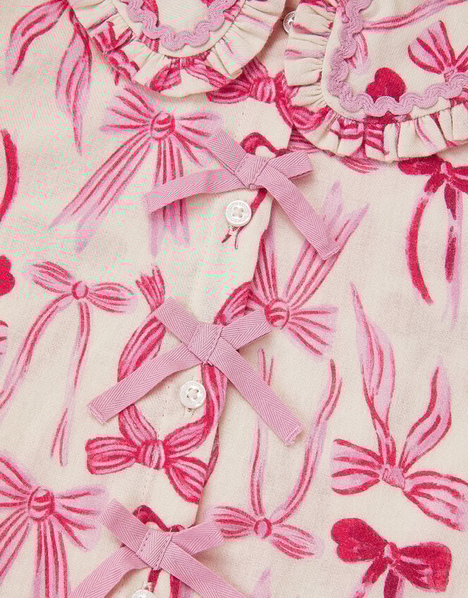 Sweet dreams are made of this. Patterned with cute bows in pretty hues, this pyjama set includes a long sleeve top and full-length bottoms. Finished with a peter pan collar, frilly trims, decorative bows and front button fastenings. Cream