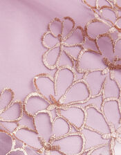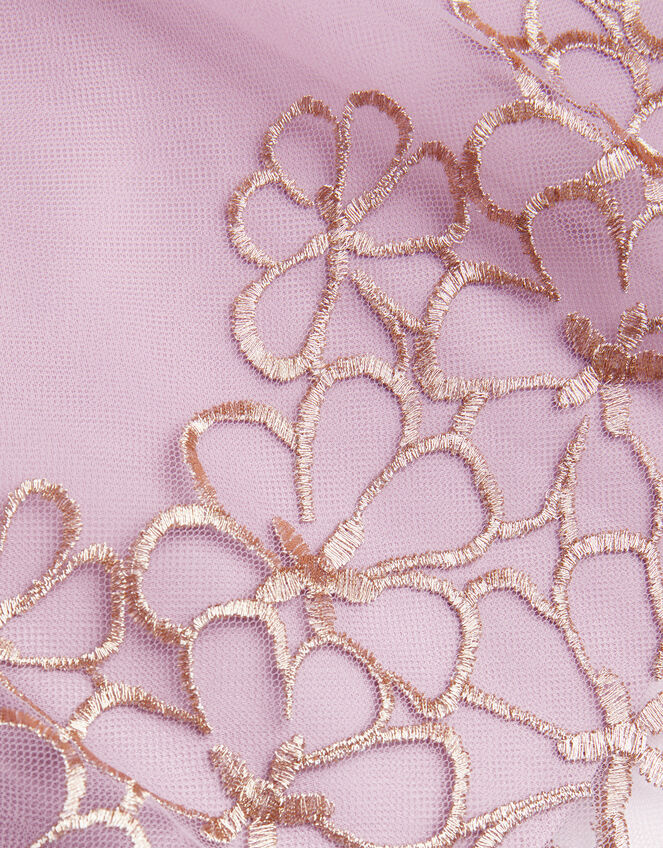 *GASP* A princess! Designed in lilac tulle, this dress is cut in a swing silhouette with long sleeves and a round collar. The best thing? It's decorated with golden floral embroidery. Pink